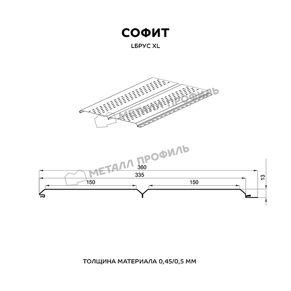 Софит — это специальные панели из серии Lбрус, оснащённые перфорацией на лицевой стороне. Они предназначены для подшивки карнизных свесов кровли. Благодаря аккуратному внешнему виду софит придаёт зданию завершённость и эстетическую целостность. Перфорированные отверстия обеспечивают вентиляцию подкровельного пространства, предотвращая скопление конденсата, а также развитие плесени и грибка.